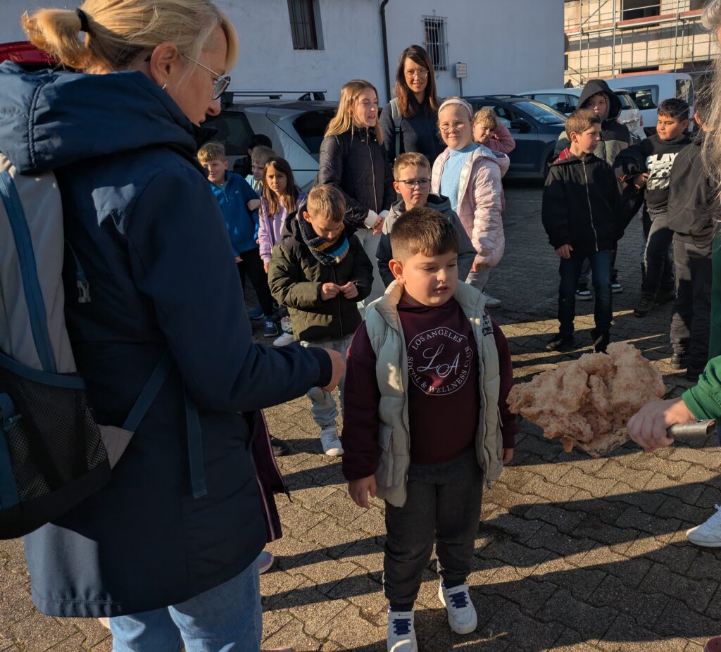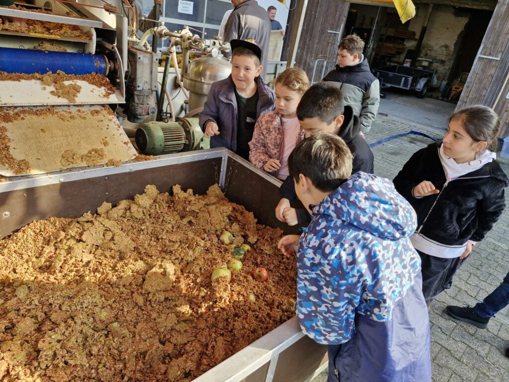 Zudem besuchten die Grundstufenklassen am 01.10.2025 bei einem gemeinsamen Lerngang die Apfelpresse. Dort konnten wir zusehen, wie aus einem Sack Äpfel Apfelsaft entstand. Darüber hinaus erfuhren wir, dass auch die Apfelreste noch sinnvoll verwertet werden. Am Ende durften wir sogar vom frischen Saft probieren. Das Urteil fiel einstimmig aus: LECKER!