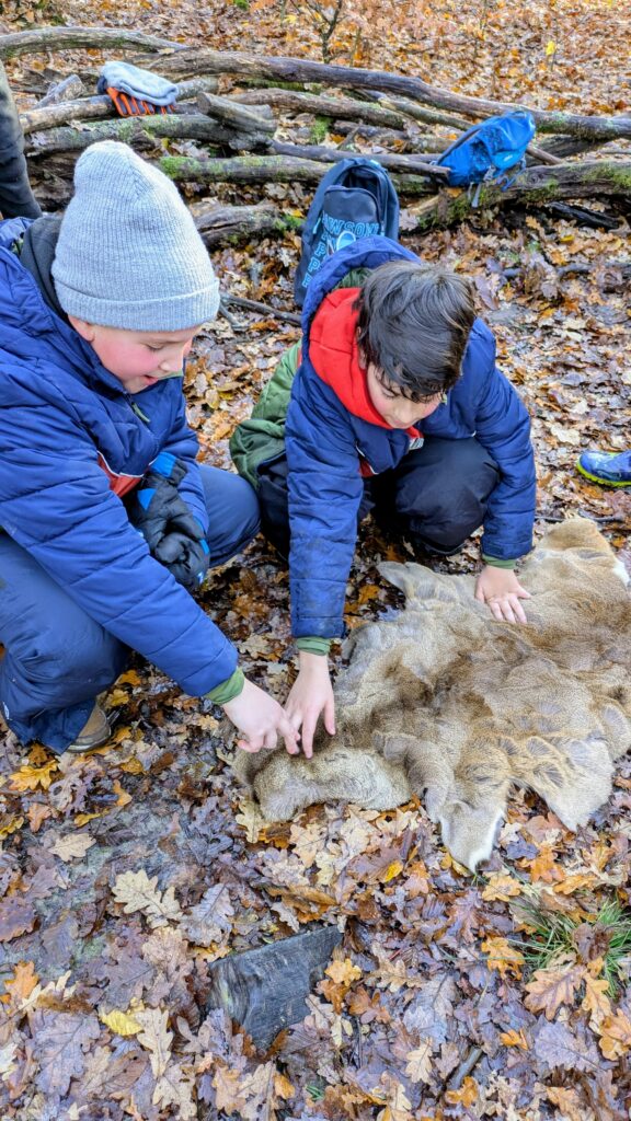 Nach einer Vesper- und Spielpause ging es weiter. Herr Bardon legte zwei Tierfelle in die Mitte und es begann eine heiße Raterunde, von welchen Tieren die Felle wohl stammen könnten. Das Staunen war groß als das Rätsel gelüftet wurde: beide Felle waren Rehfelle. Eines war das Sommerfell, das andere das Winterfell. Die Natur ist wahrlich erstaunlich!